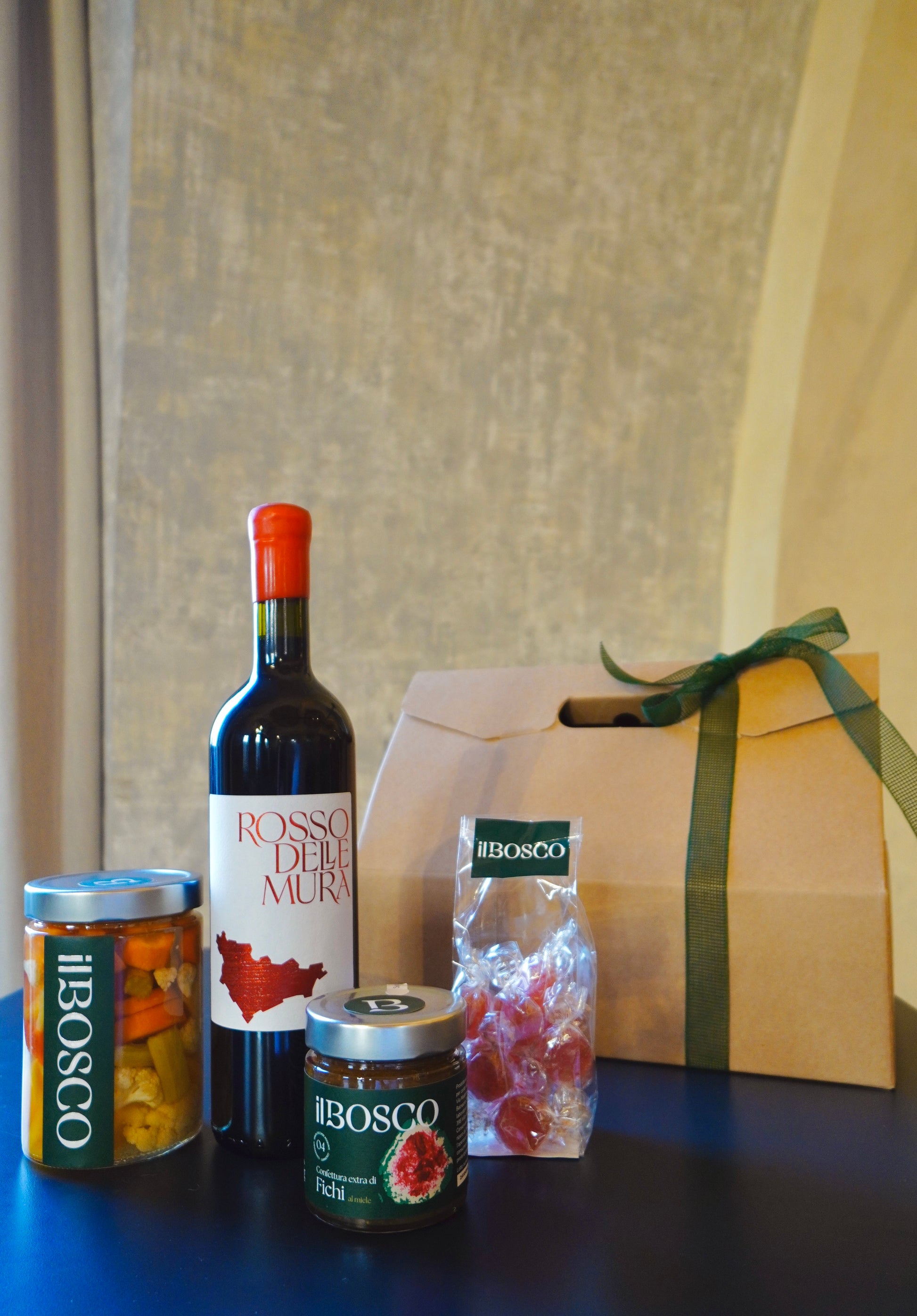 Rosso delle mura, caramelle al miele (a scelta fra mirtillo, lampone, fragola, arancia e limone), giardiniera, confettura (a scelta tra fragola, frutti di bosco, pesca, albicocca, cipolle, fichi).